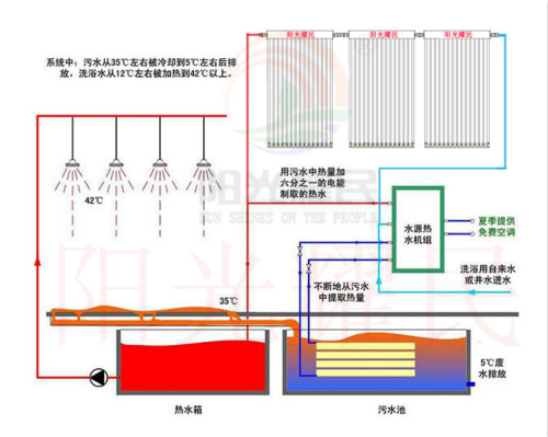 《洗浴排水熱能回收系統(tǒng)》是一項采用太陽能+熱泵,回收洗浴后的廢水中熱能的技術(shù)。_高溫洗浴熱泵回收低溫余熱,利用這一新的技術(shù)代替?zhèn)鹘y(tǒng)加熱方法,能夠減少燃煤對大氣的污染,節(jié)約大量不可_能源。