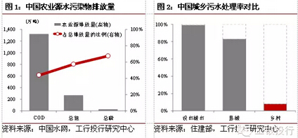 2. 上山下鄉(xiāng),到農(nóng)村去長期以來,在我國農(nóng)業(yè)領(lǐng)域的環(huán)保問題一直沒有得到充分的重視,但實(shí)際上這一領(lǐng)域的污染問題已經(jīng)相當(dāng)突出。在水體污染方面,目前農(nóng)業(yè)源占我國COD排放量的比例_過40%,占總氮排放的比例在60%左右,占總磷排放的比例_是高達(dá)70%左右。目前我國農(nóng)業(yè)水污染治理程度嚴(yán)重偏低,還處于起步階段。據(jù)統(tǒng)計(jì),我國僅北京、天津、上海、江蘇、浙江、廣東等少數(shù)發(fā)達(dá)省市的農(nóng)村生活污水處理率能夠_過10%,其他大部分省份還未全面鋪開。在我國環(huán)境承載能力日益逼近上限的現(xiàn)狀下,農(nóng)村環(huán)境治理問題開始受到高層重視,近年來,國務(wù)院、環(huán)保部、財(cái)政部、發(fā)改委在多個(gè)文件中均重點(diǎn)提及,而農(nóng)業(yè)部近日下發(fā)的《關(guān)于打好農(nóng)業(yè)面源污染防治攻堅(jiān)戰(zhàn)的實(shí)施意見》_是給出了一個(gè)較為全面的實(shí)施路線圖。